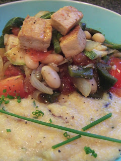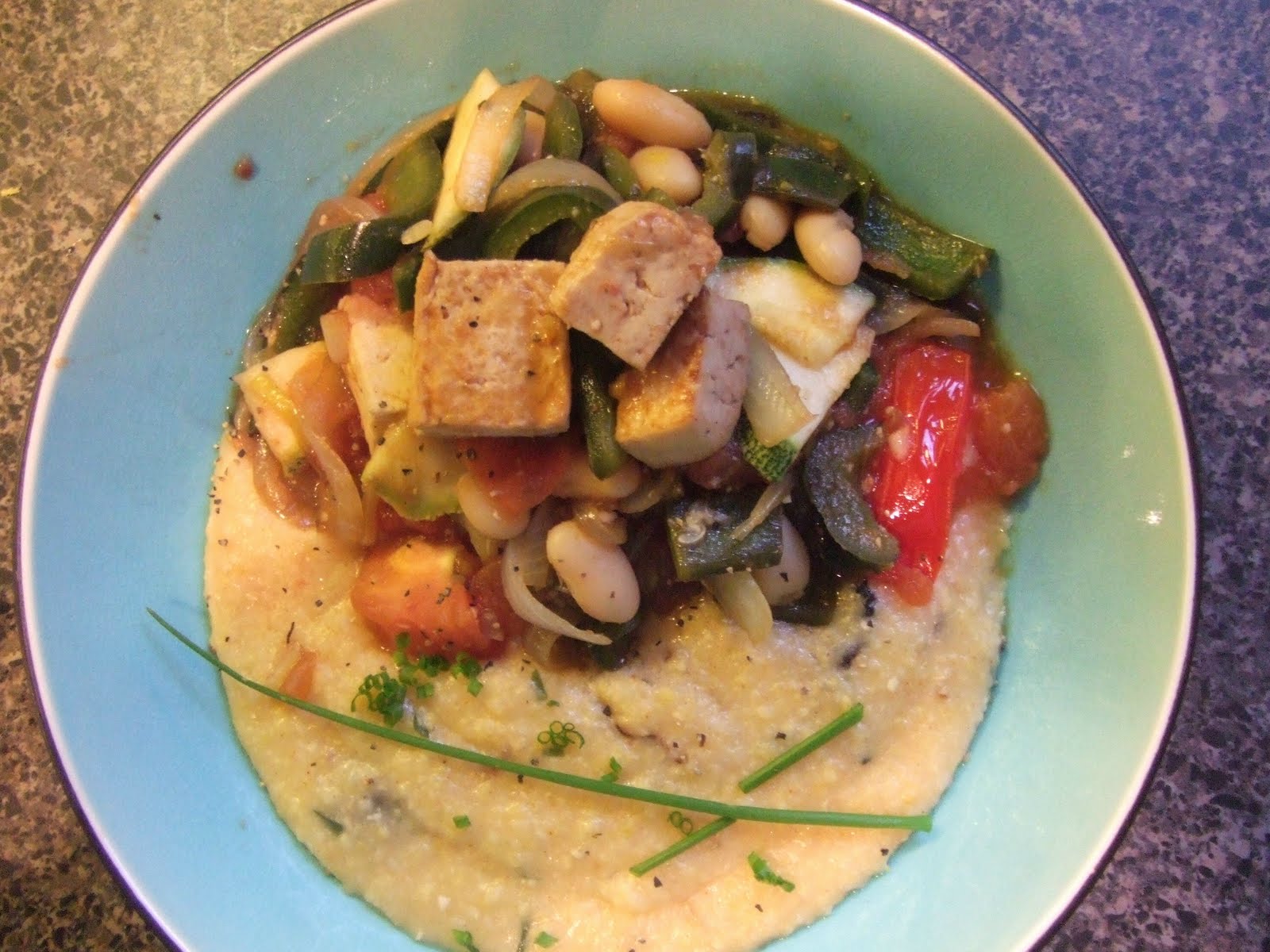 Once home, we had a craving for something stewy. I had a few vegetables, some cornmeal. Plenty enough to make a nice vegetable medley with some rich polenta (we had rice the day before!)